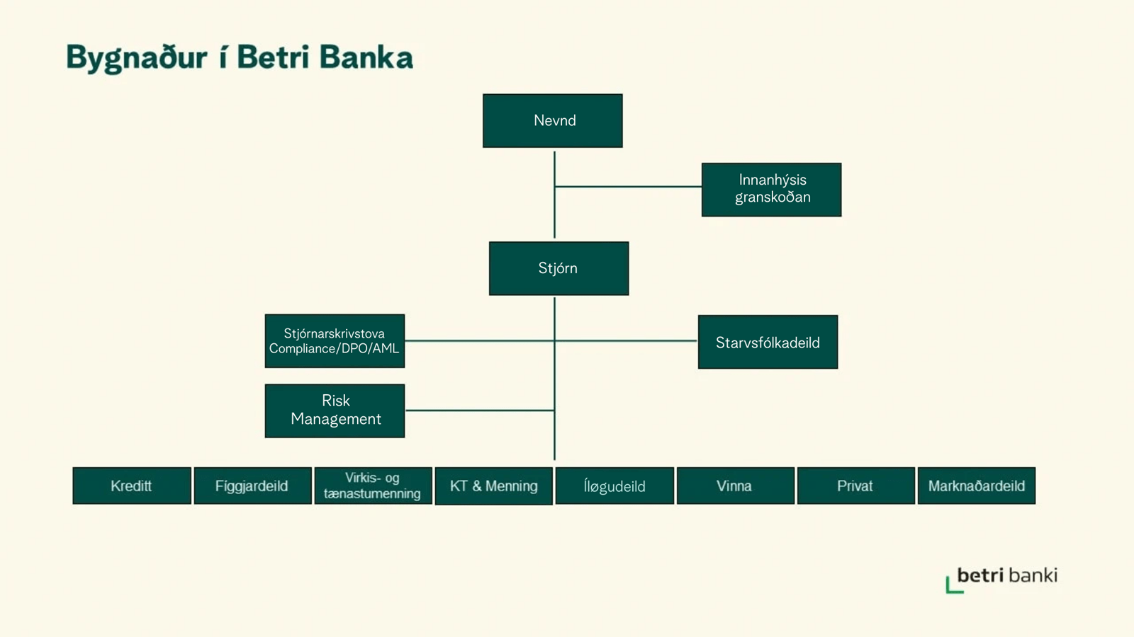 Betri Banki hevur fylgjandi leiðsluskipan, samsvarandi lóg um fíggjarligt virksemi § 80 c, stk. 2, sum tryggjar, at leiðslan í bankanum er munagóð og varin.