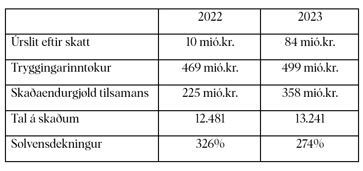 Óvanliga nógvir skaðar, yvir hálvtfjórðhundrað milliónir krónur í endurgjaldi og gott úrslit, serliga tí íløgurnar aftur geva gott avkast. Hartil fleiri og betri tryggingar og tænastur - og eitt stórt stig inn í talgilda heimin við appini Mín Trygging. So stutt kunnu vit taka saman um 2023.